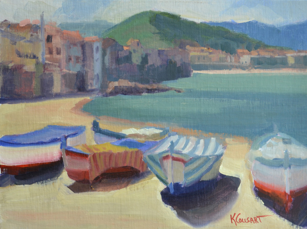 Adore awnings and got the drawing and perspective like a champ! I was tickled when my mentor teacher Jim Richards said it was my best drawing/sketch ever! Nothing like starting out on a high note! The biggest concept I think about when I paint is light and shadow. I loved the beautiful flowers and kept wanting to put them lighter as if they were in sunlight. Well, that gorgeous awning protects them and they are shaded. So, that meant my darks could hold it all together and some of the pots needed a variety of saturated colors to read as the tops of the flowers. Love learning from Jim and that light and dark concept dates all the way back to how Rembrandt loved to paint. I am a lucky girl!