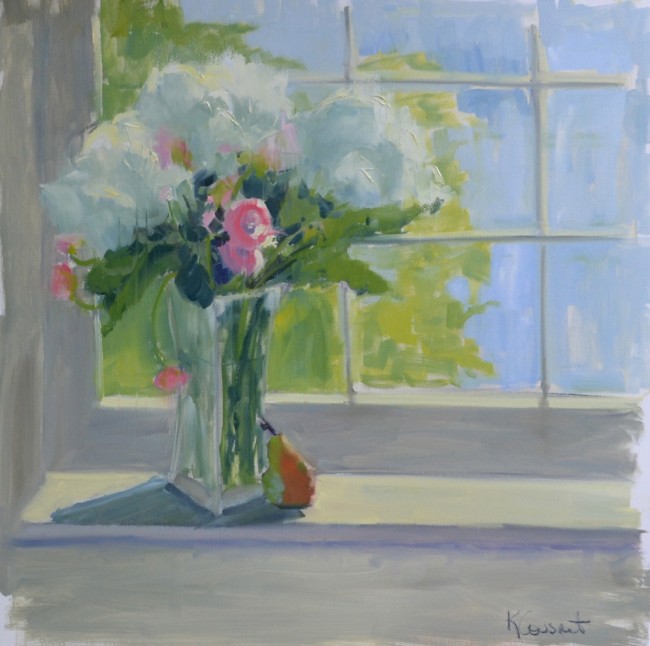 MoooooooWhoooooooo! That’s A LOT of cows in this painting! Fun yet hard to paint them with their black and white markings in light and shadow. I had forgotten how long it took me to do a different painting with a bunch of cows the first time around. I had that first cow painting hanging in a wonderful Bed and Breakfast in downtown Watkinsville through Sunshine Gallery. A collector was having breakfast and loved the painting but wanted a bigger size. I was game and had fun changing up the composition and format just a bit for them. That same collector also purchased the big 40 x 40 floral below, “Come to my Window”, so I was happy to do a favor! Thanks to all involved and just fun living in a small town where everyone works together.