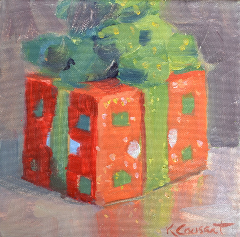 Monthly Spotlight:Gumball Wizard, 11 x 14 Oil on Linen Here's why! I must just love red...And this just called to me. It was fun and different and unique and I just had to paint it. Thanks to friend Martha, who brought it to Nancy's small workshop- I got hooked on the first one and had to go buy my own gumball machine. This is the second one I have done and I just adore it! Happy and fun and love all the shifts in the glass globe. I am just praying someone asks me to paint a huge one for them. I would be honored and love that!! The sweet little present below is just perfect for the Holiday Season. Gallery wrapped with bigger sides that can just sit anywhere and make folks smile. The Glittering Christmas Present, 8 x 8, Oil on Linen, Gallery wrapped 1 1/2 sides.