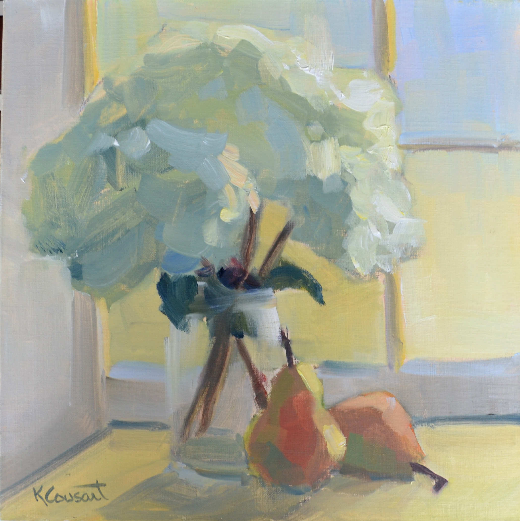 Window Sill Pears with Hydrangeas, 12 x 12, Oil on Linen I am addicted to painting gorgeous white flowers and seeing the warm and cool temperature shifts in them. It just fascinates me to no end. Love especially the soft light and shadow shapes in these snowball hydrangeas from my yard. Love pears for their simple elegance and that they always seem to have some character to them.