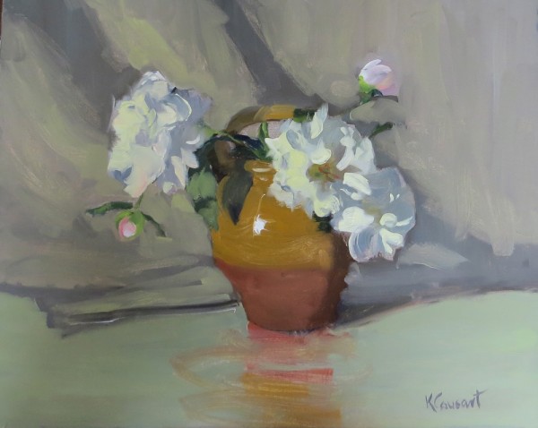 Here's What's Blooming:Peonies and don't you forget it!!! Ha! Seriously I have loved painting one of the prettiest flowers that I know of . These were through my special friend Meg Dure and her mother's roses are in the one below. Something special about painting homegrown flowers! I am blessed in so many ways! Oh- and love the antique French Water Pot from Provence:) Through the Garden Gate, 16 x 20, Oil on Board