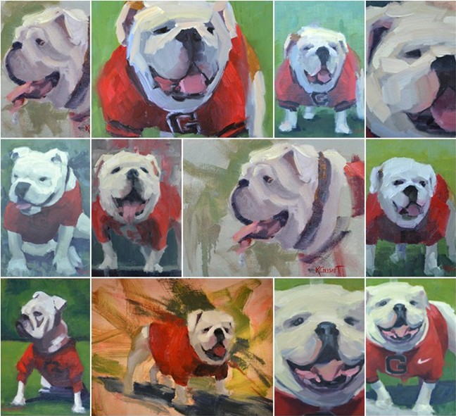 It is that time of year again...back to school and college football! I love painting these University of Georgia Bulldogs and scenes from the UGA campus. I feel such a connection being an Alumni and also former Georgia Coach! I am so honored that one of my larger paintings of UGA III is hanging in Butts Mehre on campus. This Season Starter Dawg is a personal favorite. I have fun capturing the character and think they have a sophistication that makes for charming fine art...See, I told ya...I just love my dawgs!